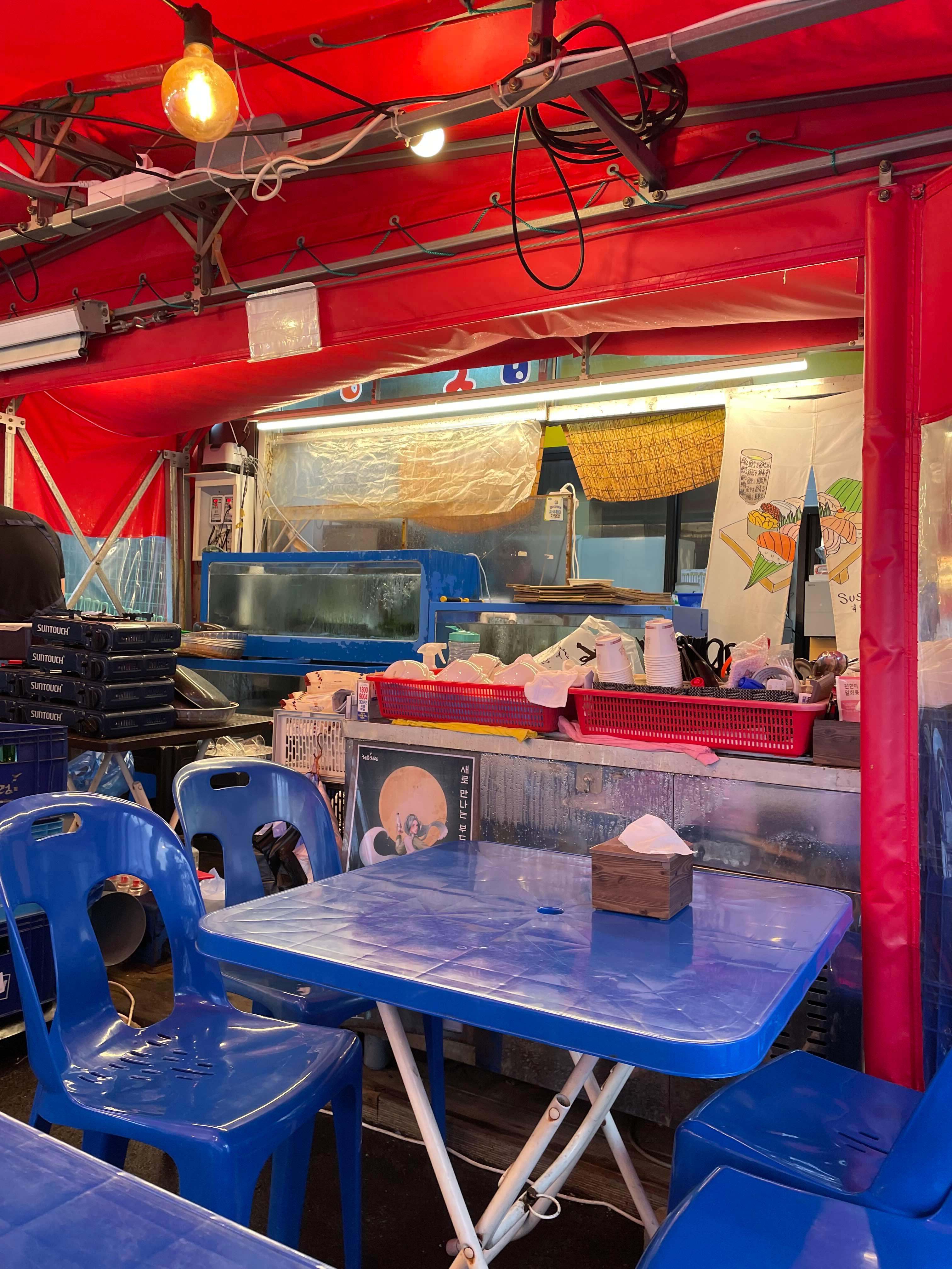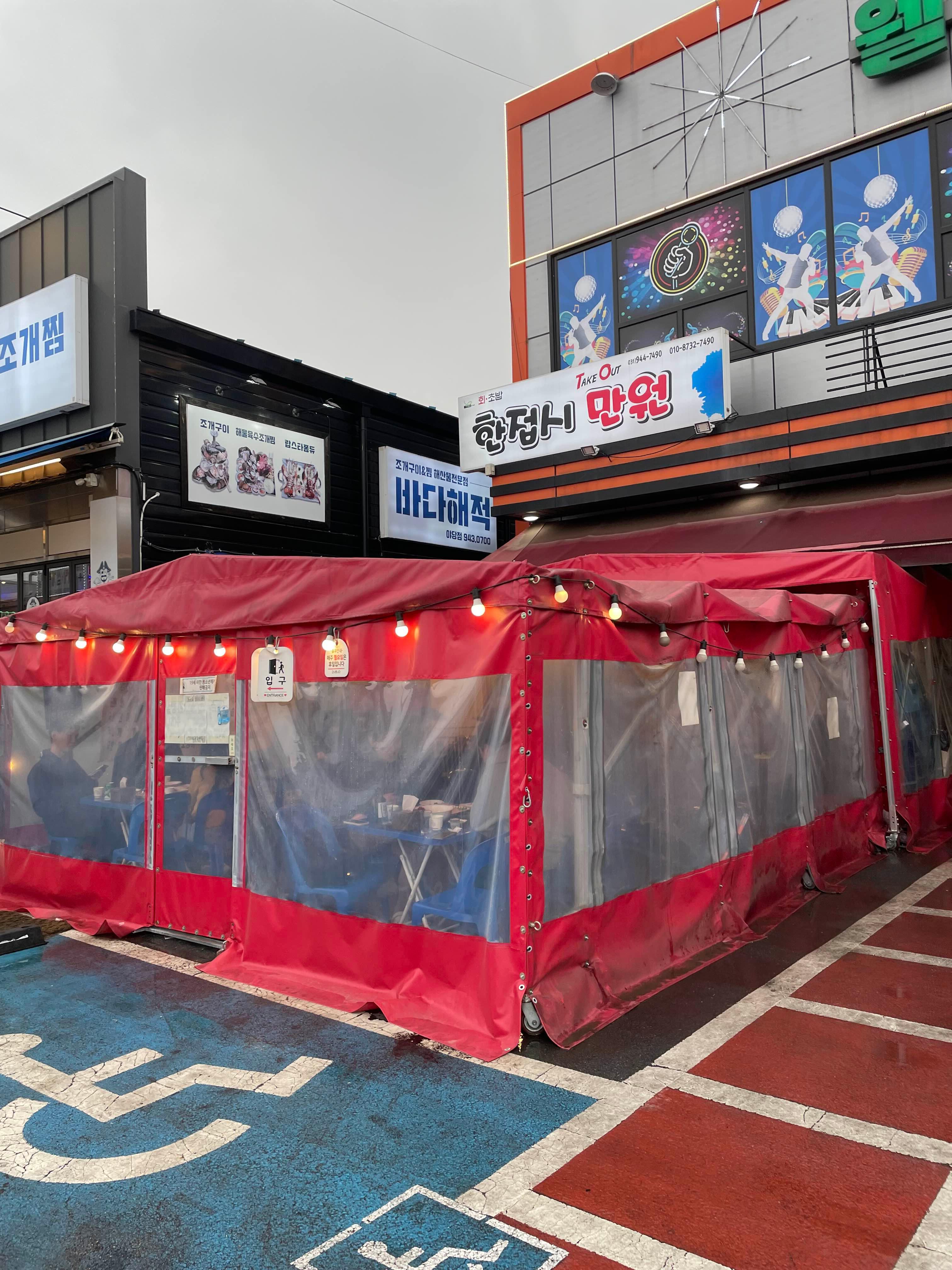빨간 천막과 형광 조명이 인상적인 외관, 마치 포장마차 감성이 물씬 나죠.