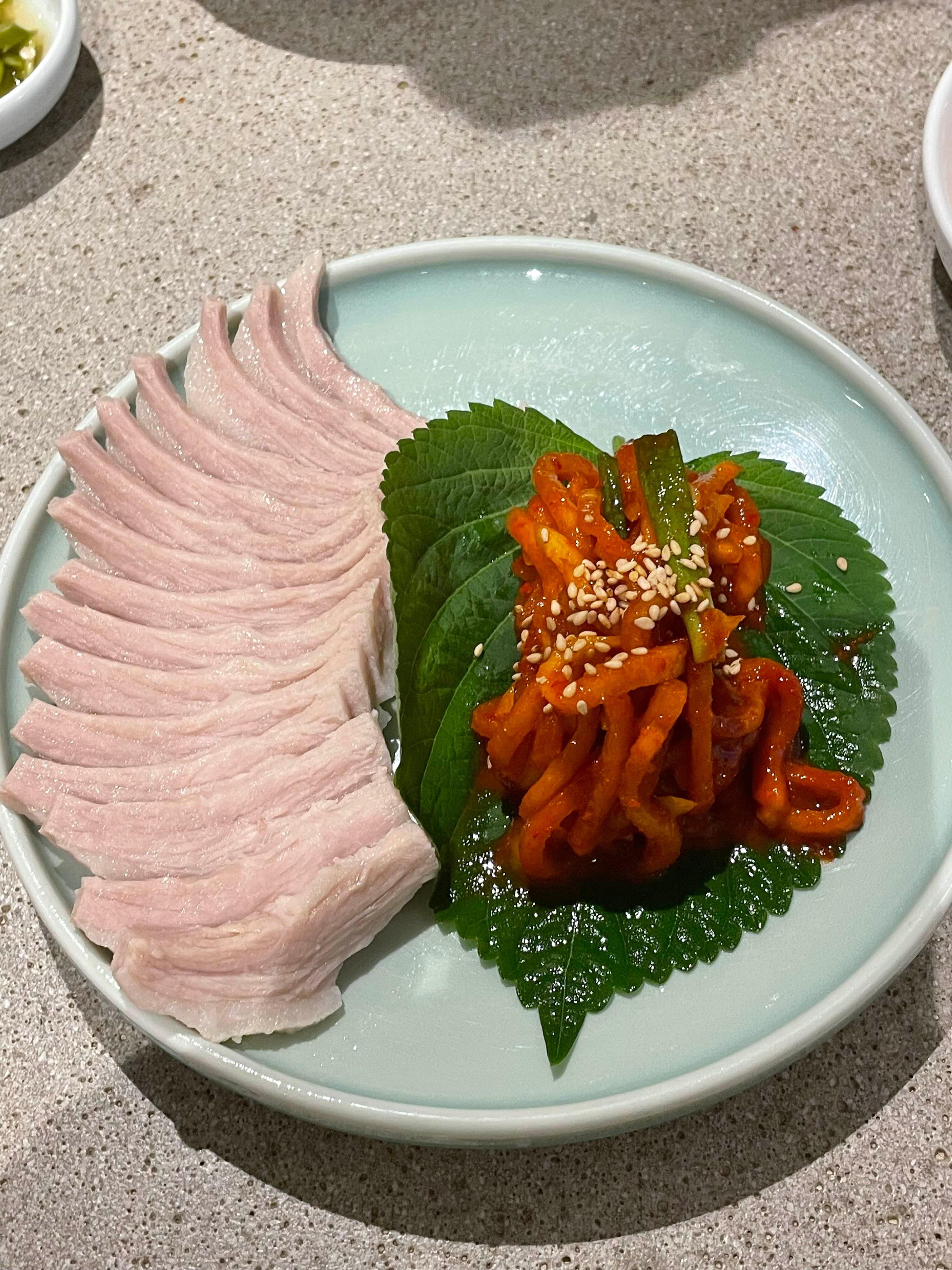 고기가 얇게 잘 썰어져 나와서 냉면과 함께 먹기에 딱 좋았습니다. 기름기가 적당하면서도 고소한 맛이 일품이었어요. 새우젓, 땡초 등 함께 제공되는 양념장과 함께 먹으니 더욱 맛있었습니다.